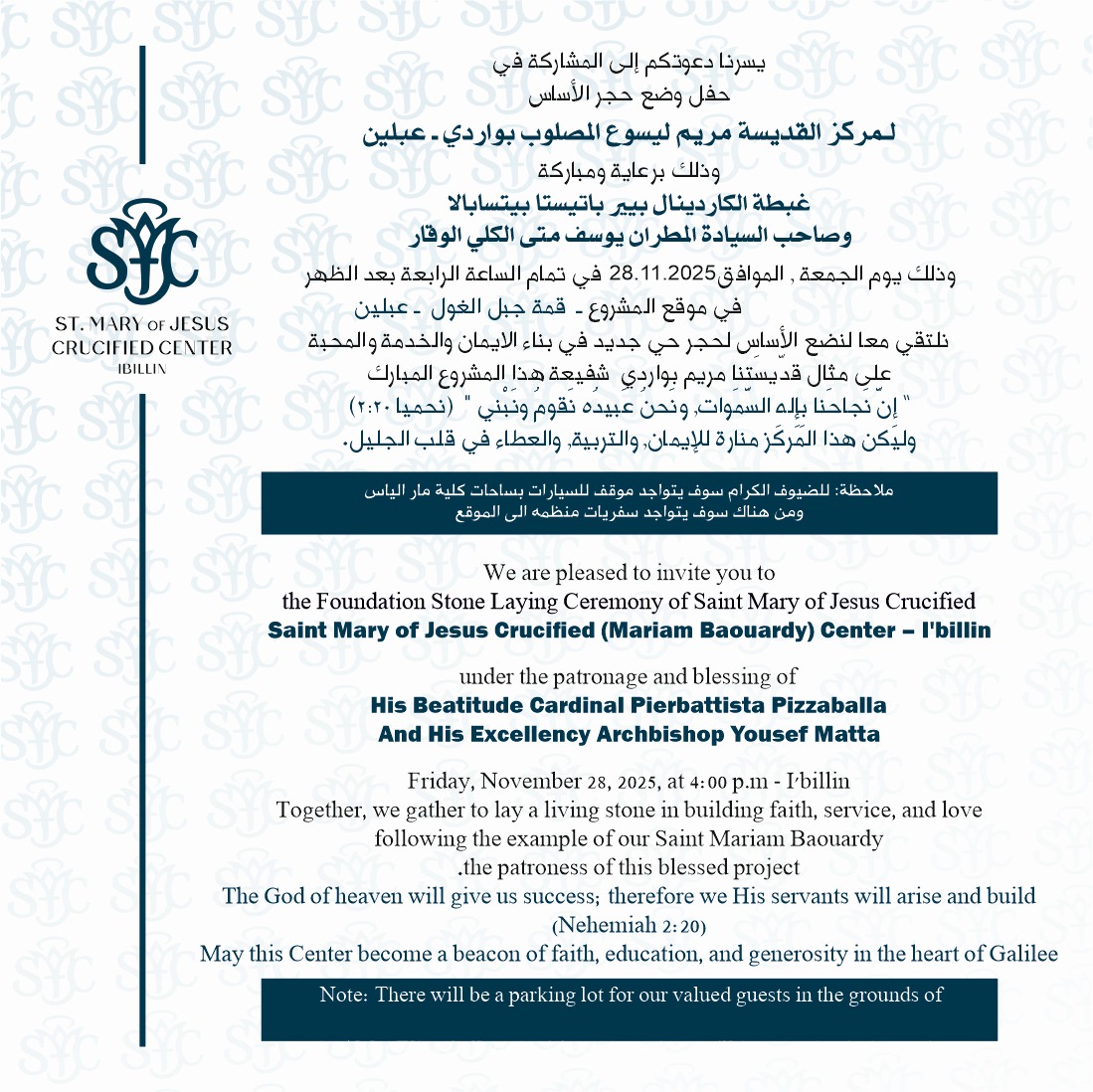 بواسطةstmbawardycenterنضع بين أيديكم النص الكامل لصلاة وضع حجر الأساس لمركز القديسة مريم ليسوع المصلوب بواردي، لتكون لنا جميعًا لحظة تأمل ووحدة روحيّة، نتّحد فيها بالصلاة شاكرين الله على هذه البداية المباركة، وطالبين شفاعة القديسة مريم ليسوع المصلوب بواردي أن تظلّ تظلل هذا المكان بنعمتها وسلامها.